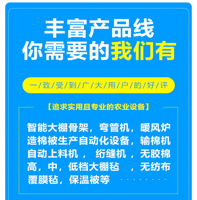 本公司設(shè)備齊全,可生產(chǎn)智能大棚骨架,彎管機(jī),暖風(fēng)爐等農(nóng)業(yè)設(shè)備,另制造棉被生產(chǎn)自動(dòng)化設(shè)備,自動(dòng)上料機(jī),輸棉機(jī),絎縫機(jī)等。質(zhì)量可靠,注重創(chuàng)新。公司擁有雄厚的實(shí)力,先進(jìn)的生產(chǎn)線,豐富的經(jīng)驗(yàn),可根據(jù)客戶的要求定做高,中,低檔大棚氈,無紡布,無膠棉,覆膜氈,保溫被等,車間日生產(chǎn)新型棉被10000平方米以上,能滿足各種客戶的需求,新型保溫被產(chǎn)品在國內(nèi)研發(fā)中始終保持在前列。